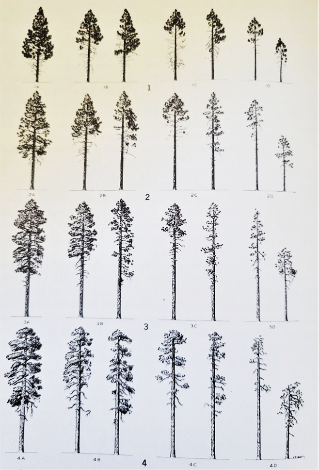 The process of choosing which trees to favor in a forest stand can be complex, but the decision always involves carefully comparing the condition of different trees. Sometimes, a tree in less than optimal growing conditions may benefit from more room to grow and reduced competition – but not always. Various classifications have been developed to systematize the process, but it’s especially hard in complex native mixed hardwood stands like those found in the North Quabbin. Figure 3 shows one example of a system based on age and vigor class for a western conifer – Ponderosa Pine. Although not a Massachusetts species, it illustrates the concept of condition class well.