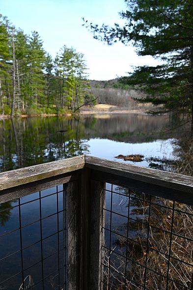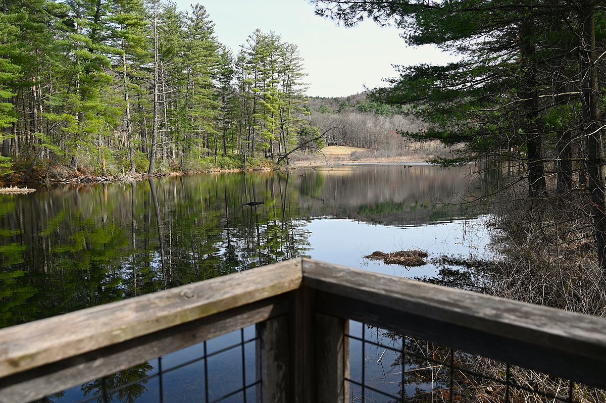 The Ames Accessible Nature Trail, the sole path on the property, stretches for half a mile and is accessible to both wheelchairs and strollers. To enhance your experience, Mount Grace has placed benches along the trail. The observation deck offers stunning views of the wetland, making it a perfect spot for wildlife and birdwatching.