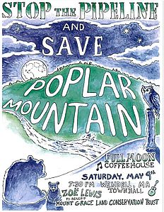 Poplar Mountain is one of nearly one-thousand parcels which would be crossed by the pipeline. Statewide, the proposed pipeline would run through (or within 200' of) 148 permanently protected parcels, including 19 conserved farms; 6 state forests; 5 state wildlife management areas; 26 town forests, conservation areas, or CRs; 10 protected watershed areas; 5 sections of National Scenic Trails; 12 land trust properties; 6 sporting clubs; a municipal playground; and a YMCA Camp and under numerous waterways including the Connecticut River, the Millers River, and the Deerfield River.