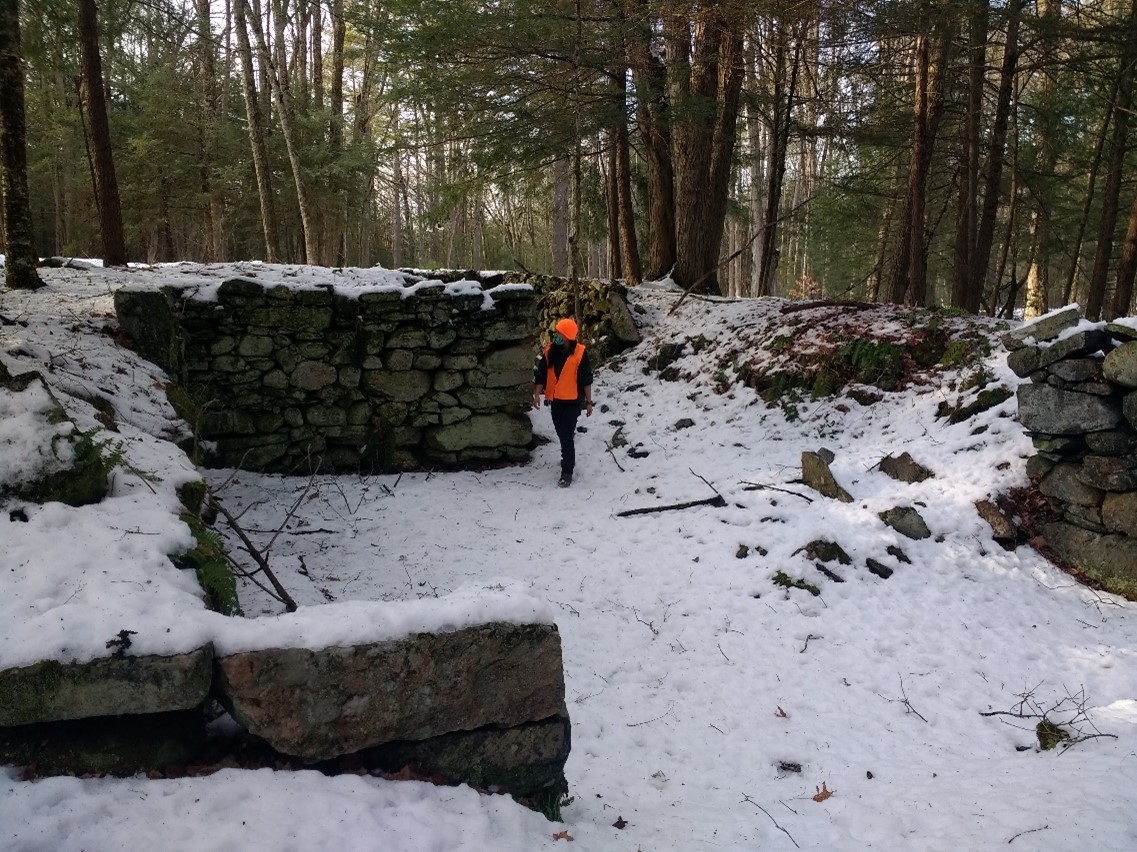 In addition to the timber harvesting potential, Brian’s conserved property also has unique natural, cultural, and recreational features that the public are welcome to experience. One side of the property displays rugged terrain with bear dens, rock outcroppings, ravines, and a nice view into Wendell. On the other side, Brian maintains walking trails, which include a segment of one of the town’s first roads that connected Petersham to North Dana and New Salem. Here, hikers can admire the foundation of an old farm building that belonged to one of Petersham’s first European settlers. Locals maintain hidden mountain bike trails and, although Brian is not a hunter, hunting is allowed on his land as well.