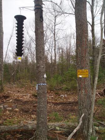Mount Grace and the Forest Service chose 40 experimental trees: 20 White Pines and 20 Red Maples, all with a diameter of 12 inches or more. Our goal is to attract large numbers of insects to these trees in hopes that enough of them will burrow into the tree to kill it and form a snag. Because these are live trees and the insects are attracted to dead and dying trees, we placed pheromone lures on half of the experimental trees while the rest were left as the control group.
