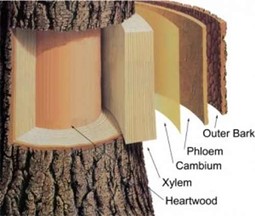 The cambium, a thin layer of cells just inside the bark, produces phloem on its bark side and xylem on its inside (Fig. 3). Xylem is the wood that increases a tree’s diameter. Everyone is familiar with annual growth rings distinguishable in the wood of most native trees. The rings are generally visible because the cells forming earlier in the growing season are larger than those formed later. Also, cell wall thickness typically increases later in the growing season.